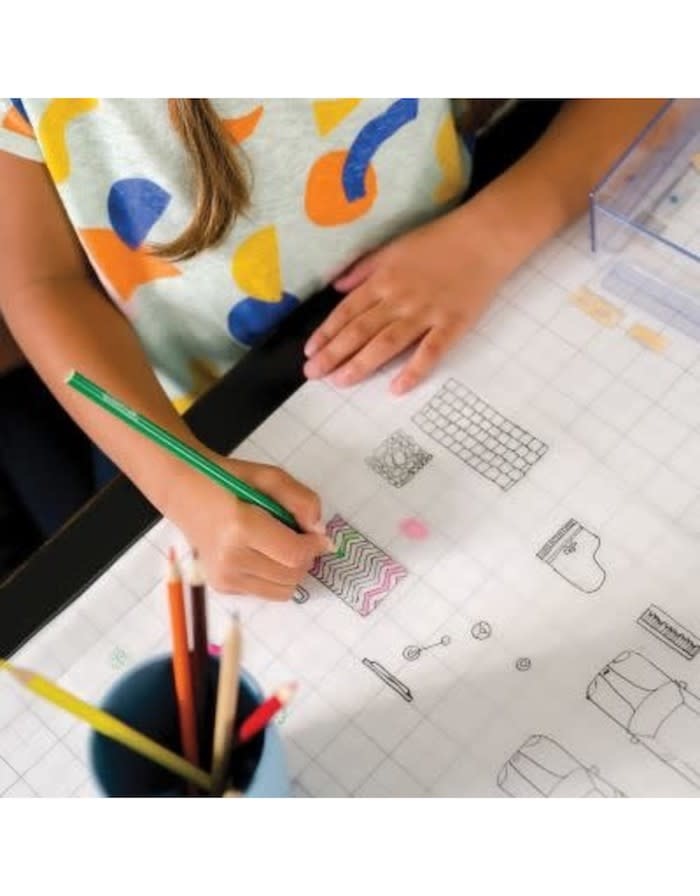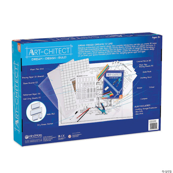This one-of-a-kind activity teaches aspiring architects and interior designers about drawing, design and architecture while they create their own 3-D home model. This introduction to architecture sparks the imagination as kids use real architectural tools like a drafting triangle, compass and more to design, furnish and decorate floor plans using the detailed guidebook, static-cling doors and windows, furniture templates, drafting paper, 18" x 24" acrylic work surface, art supplies and more.