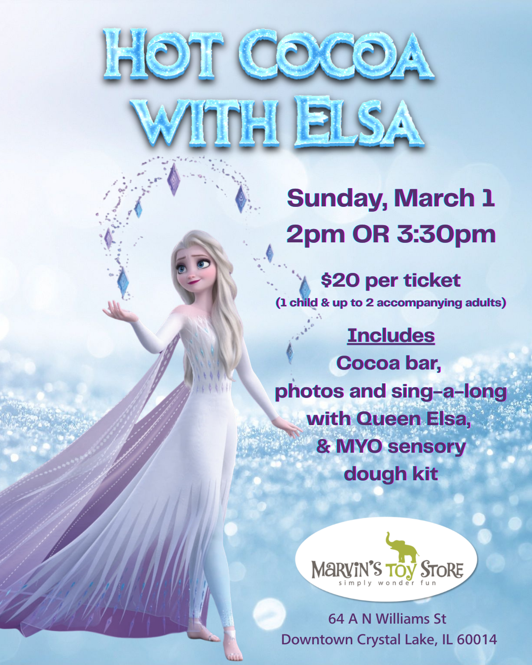 Parents, give your little one a magical afternoon. Join us for a cozy, joy-filled experience with Queen Elsa that’s perfect for young children who love sparkle, songs, and sweet treats.
