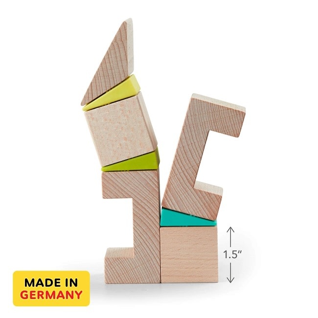 Get ready for some wobbly and wonky building fun! With the Crooked Towers Wooden Block Set kids can use their manual dexterity and powers of imagination to create crooked towers, wobbly bridges, and sloping structures or match the enclosed template cards. In addition to the familiar rectangular shapes, these blocks become a 3D arranging game featuring interesting geometric wooden blocks, triangles, steps, and colorful wedges. Children’s creativity can run free and when they need a new challenge, they can consult the enclosed template cards giving young builders new ideas – in three levels of difficulty. Complement with our other set of wobbly fun arranging set, Teetering Towers Wooden Blocks.