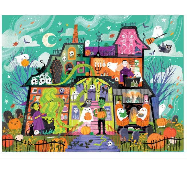Crocodile Creek's 36-piece Haunted House puzzle will delight all ages with its whimsical and colorful depiction of a fun Haunted House filled with ghosts, witches and monsters. 16" x 20" floor puzzle