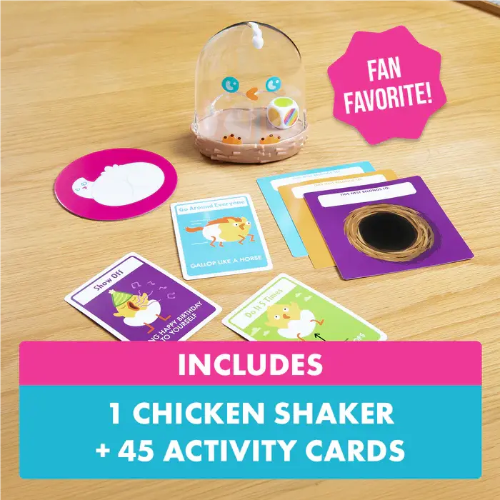 Shake the Chicken to reveal your activity, then quickly perform it before passing the Chicken Shaker to the next player. Don’t get caught holding the Chicken when the timer goes off! This game is fast, funny and it’s different every time. Plus, everyone has an equal chance to win…especially the little ones!