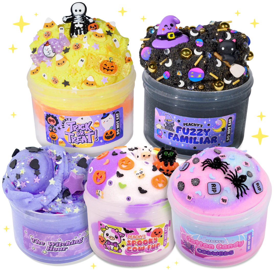This playful slime is packed with Peachy and Halloween-themed charms, mix-ins, and sprinkles, making it the perfect treat for a spooky celebration!