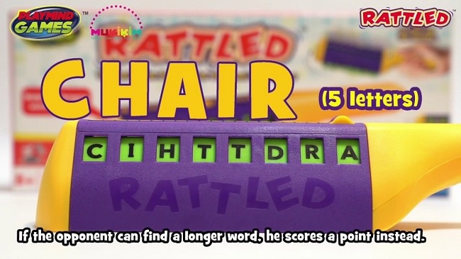 Portable Family Game: Rattles is a fast-paced and challenging word search game. Two players/teams take turns and race to make the longest word possible out of the 8 letters showing; who finds a longer word in 30 seconds wins a point.