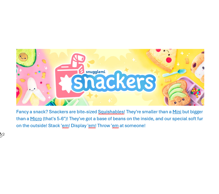 Fancy a snack? Snackers are bite-sized Squishables! They're smaller than a mini but bigger than a micro (that's 5-6")! They've got a base of beans on the inside, and our special soft fur on the outside! Stack 'em! Display 'em! Throw 'em at someone! [Editors note: don't throw them at someone.]