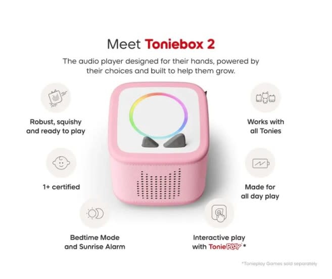 - MADE FOR INDEPENDENT PLAY Designed with kid-friendly, intuitive controls, Toniebox 2 lets listeners explore stories, songs and games from all their favorite characters all on their own, boosting their confidence and independence.