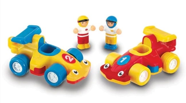 Push The Turbo Twins racing cars along to power their motorised engines to speed them off as they compete against each other for 1st place. With cool spoilers and removable driver Play Friends, their rear magnetic hooks mean this rapid racing duo are also compatible with all WOW Toys trailers.